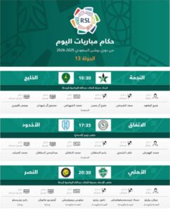 كما كشف الاتحاد السعودي عن طاقم حكام باقي مباريات اليوم الجمعة في الجولة 13 من دوري روشن، والتي ستجمع كلاً من الخليج ضد النجمة، والاتفاق أمام الأخدود.