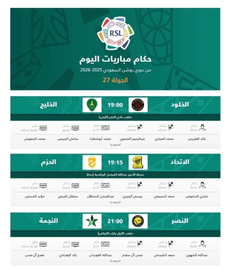 وإليكم طاقم حُكّام مباريات اليوم الجمعة في الجولة 27 من دوري روشن.